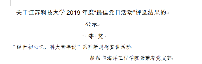 为学习贯彻“不忘初心、牢记使命”主题教育精神,深入开展党员教育培训工作,色情漫画 党支部积极组织最佳党日活动的策划与申报,充分发挥党员同志的先锋模范作用,进一步增强党组织的凝聚力和战斗力。在江苏科技大学2019年度最佳党日评选活动中,景荣春党支部获得一等奖、三等奖各一项。
