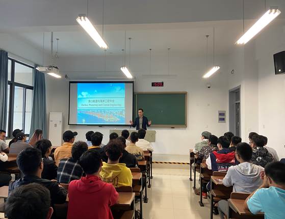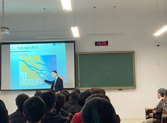 紧接着,专业负责人周效国老师从专业前沿角度给同学们解读港航专业。他绘声绘色地给大家讲解了港航专业悠久的发展历史、专业内涵与特点、学习内容与方法及毕业去向和发展前景。从古至今,人尽思量水利之道,终摸索其中道理,修大坝,筑河堤,建港口,衔接各地,壮大贸易;港航专业,内涵丰富,特点鲜明,于众多水利专业,甚至大学专业中脱颖而出,专业前景光明,就业渠道广泛。