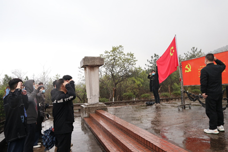 迎着小雨,学生党员们顺着高骊山台阶来到韦岗战斗胜利纪念碑前。在党支部副书记容学苹同志的带领下,全体党员一起高举右手,面对鲜红的党旗,再次庄严宣誓:“我志愿加入中国共产党……随时准备为党和人民牺牲一切,永不叛党。”铿锵有力的誓词,激励着广大青年党员同志坚定理想信念,不忘初心,践行担当使命。