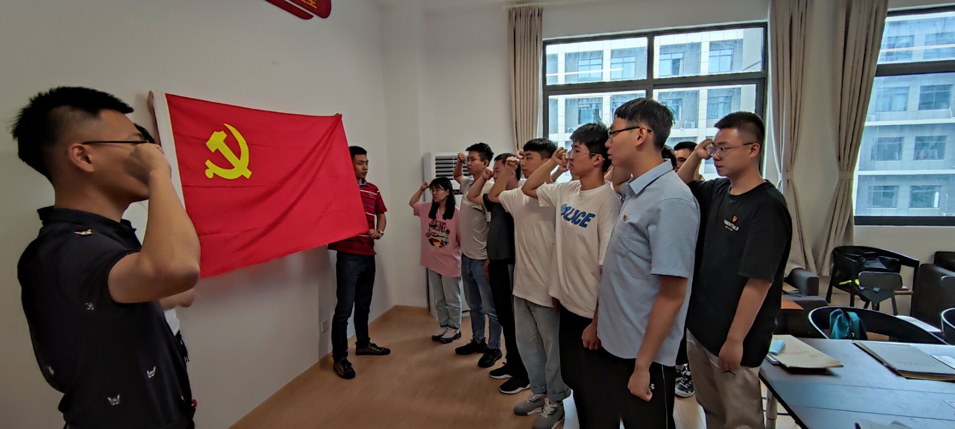 会议最后一个流程,由夏书记带领全体党员同志面对党旗再次宣读入党誓词,坚定共产主义信念,为共产主义事业奋斗终身。