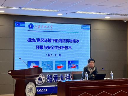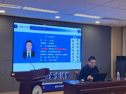 白旭教授围绕“加快实施一批具有战略性全局性前瞻性的国家重大科技项目,增强自主创新能力”主题,从研究背景、实验方案、实验结果等方面向同学们讲解了“极地/寒区环境下船海结构物结冰预报与安全性分析技术”,结合具体的船舶结冰典型特征进行了机理分析,让大家对极地船舶结构物的结冰预报技术的研究有了一定了解。博士生陈鑫作为本硕博均在江科大就读的优秀代表,就自己的科研历程和经验展开了分享,他提出做科研思想上要重视、态度上要端正、方法上要正确,要学会学习、学会利用工具,以及尽可能多地参加学术研讨会。硕士生崔福音从学科竞赛的角度就如何获得互联网+大学生创新创业大赛全国银奖的经历与经验进行了交流,就如何在高水平学科竞赛中取得优异成绩进行了分享。