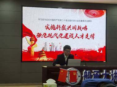 学生代表高蕴、黄宇、蒲虹宇和邢谕华结合党的二十大报告,分别以“实施科教兴国战略”、“推进文化自信自强”、“增进民生福祉”和“强军与科技创新”为主题分享了自己的思考和感悟。参会同学反响热烈,纷纷表示更加清醒认识到身上肩负的历史使命,将从学习生活中认真贯彻落实党的二十大精神内涵。