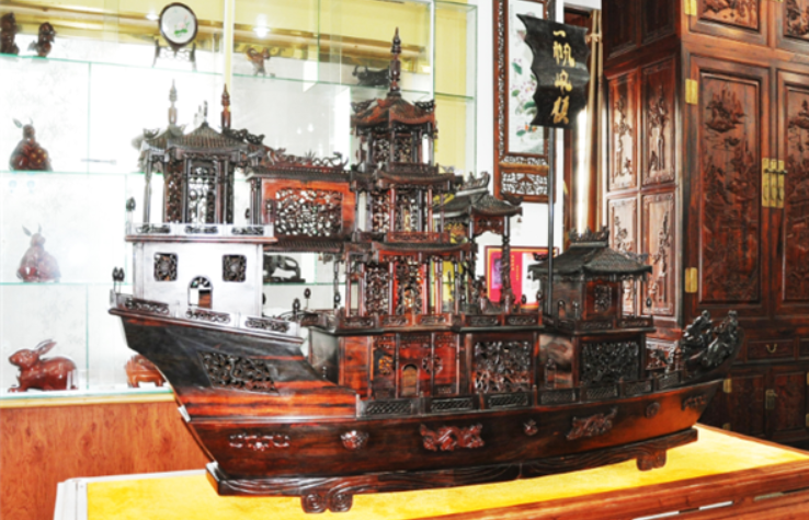 “一帆风顺”,用料大红酸枝。见到此物,仿佛回到了我国古代造船业的顶峰——郑和下西洋。据历史记载,当时郑和舰队中最大帆船长四十四丈四尺,宽十八丈,是当时世界上最大的海船。精美的古代帆船,寓意一帆风顺。这艘仿制木船以手工制作为主,工艺精湛,凝聚着中国传统文化和“精细木作技艺”之精华。