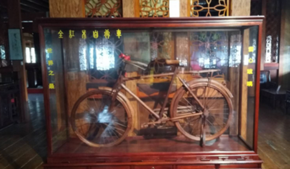 “二八杠自行车”,材质红花梨。采用世界顶级整块红花梨为原料,由大国工匠、“精细木作技艺”传承人牛瑞胜老师根据80年代初期二八大杠自行车按原版比例反复推敲缩小10倍从2003至2006年精心制作而成。艺术含量极高:龙头可摆动;前后车轮可转动,左右脚踏板可以同时使用;轴心可以随意转动。此车其中还蕴含着更深的含义:见到此车,人们不自觉就会想起国家艰苦奋斗的日子,从而更加珍惜现如今美好的生活,这就是“精细木作技艺”的出神入化之处。