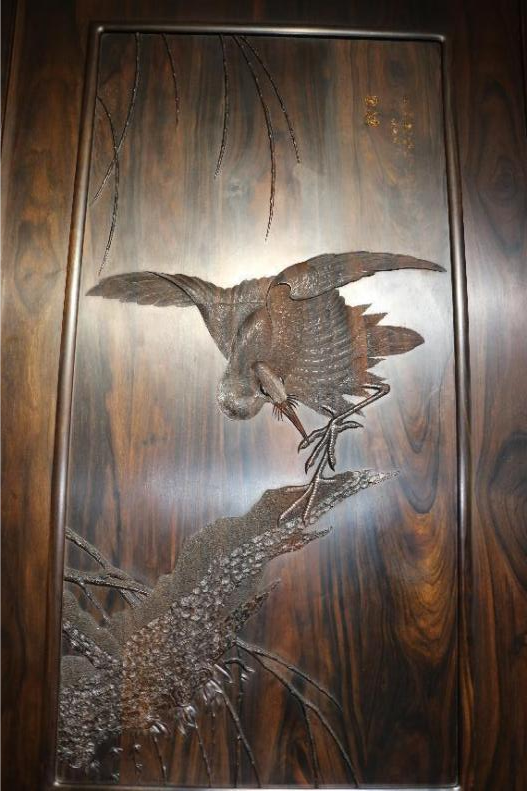 随后,王老师向同学们介绍了多个通过“精细木作技艺”制作出的作品,如“白鹭挂屏”,材质紫植木。此画有这很深的含义,一些古画虽然精美,但是却无法长久的保存,很容易受到损坏,若是以“精细木作技艺”的手法进行雕刻,画的雕刻细腻不仅精美,而且此画也会一直传承下去。由此和传统画术相比,“精细木作技艺”有着常规画术达不到的水准。此画是用用马达加斯加大叶紫檀精心雕刻而成,是大自然的原生态,整体雕刻栩栩如生,活灵活现,更显鲁班技艺传承。