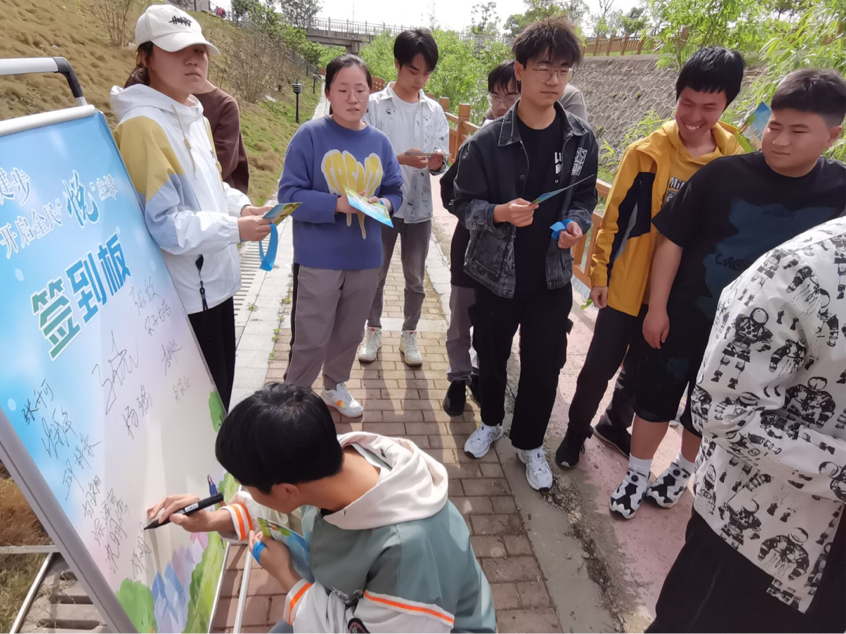 同学们来到七里河健身步道,开展健步走活动。步道旁间隔固定距离放置了有关全民阅读的宣传页,以及关于党史、科学、经济相关书籍的打卡点,同学们在运动的同时感受到了学习知识增长智慧带来的快乐,营造了爱读书、读好书、善读书的良好氛围。