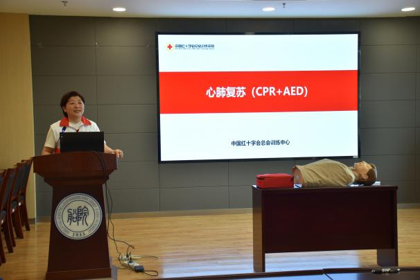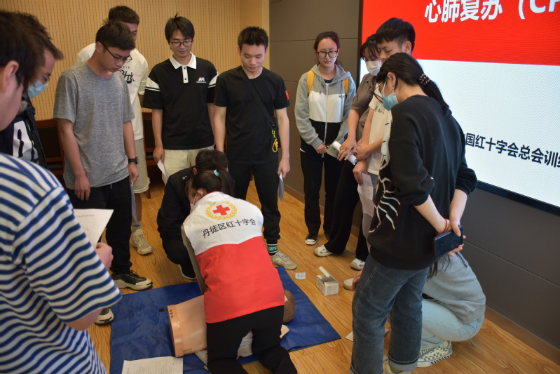 授课老师从心搏骤停的定义及表现出发,讲解心肺复苏的重要性,采用理论知识与实地操作相结合的方式,利用人体模型进行现场示范,每一个关键步骤都给同学们强调操作要点,精准位置以及规范动作,现场同学们相互探讨,认真演练,老师们给予专业性指导纠正,讲述了在何种情况下心肺复苏的实施能够产生效果,及停止的条件。张淼老师表示,自动体外除颤器的使用对提高心搏骤停患者的生存机会起到关键性作用,让同学们掌握体外自动除颤器的使用注意事项和具体操作步骤,能够在面临意外突发情况时,提供及时有效的救助。