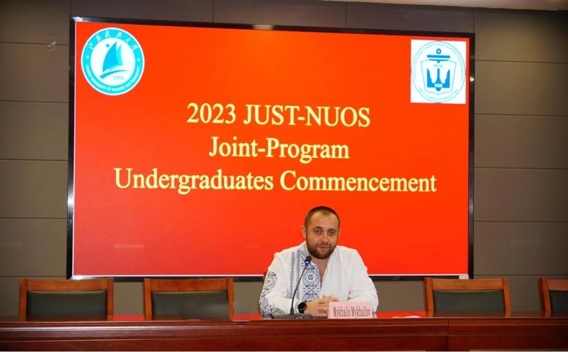 典礼上,Mykhailo MYKHAILOV副校长代表乌方致辞,他对各位项目毕业生取得的成绩表示热烈祝贺,并对江苏科技大学与乌克兰马卡洛夫国立造船大学的合作办学给予了充分肯定。他说,与江苏科技大学的合作办学项目是乌克兰马卡洛夫国立造船大学重要的海外关系之一,在两校师生的共同努力下,双方在合作办学、学术交流、科研合作等方面均取得了显著成果,希望双方继续保持友好关系,在学生培养、国际科研项目等领域开展更多形式的深度合作。