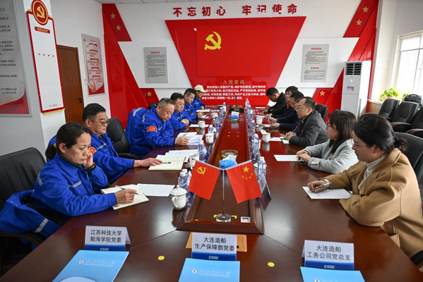 朱金介绍了学校近年来在助力毕业生高质量充分就业方面的举措,表示学校非常重视与大船集团的合作交流,希望大船集团来校开展专场招聘会,吸纳更多优质学生前往大船发展,同时进一步发挥双方在服务国家海洋强国战略方面的优势,共同推进船海科技自立自强。