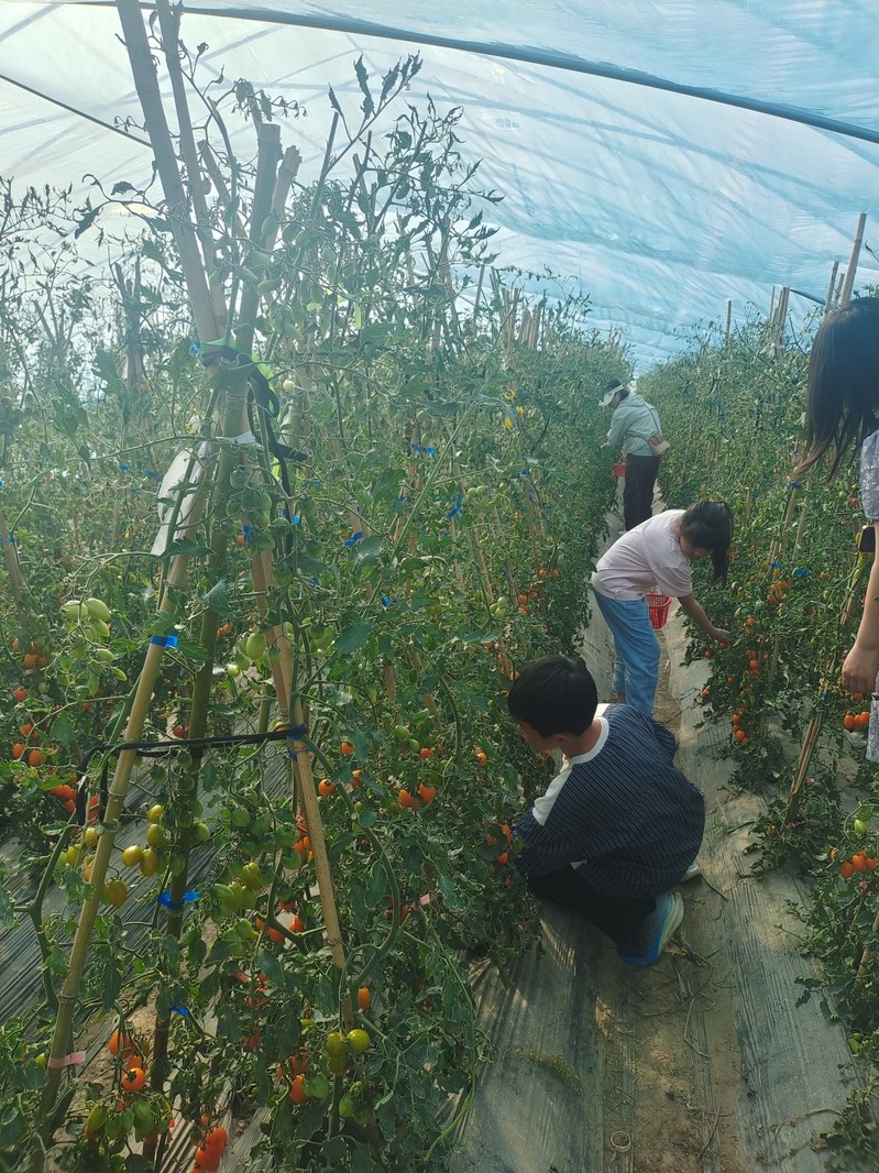 返程前的小番茄采摘环节,五颜六色的果实映照着老师们的笑脸。她们分工协作,或精心挑选、或拍照留念,将劳动成果转化为集体分享的喜悦。这份对生活的热爱与对细节的专注,恰似科研教学中精益求精的态度,让“严谨”与“浪漫”在她们身上和谐共生。