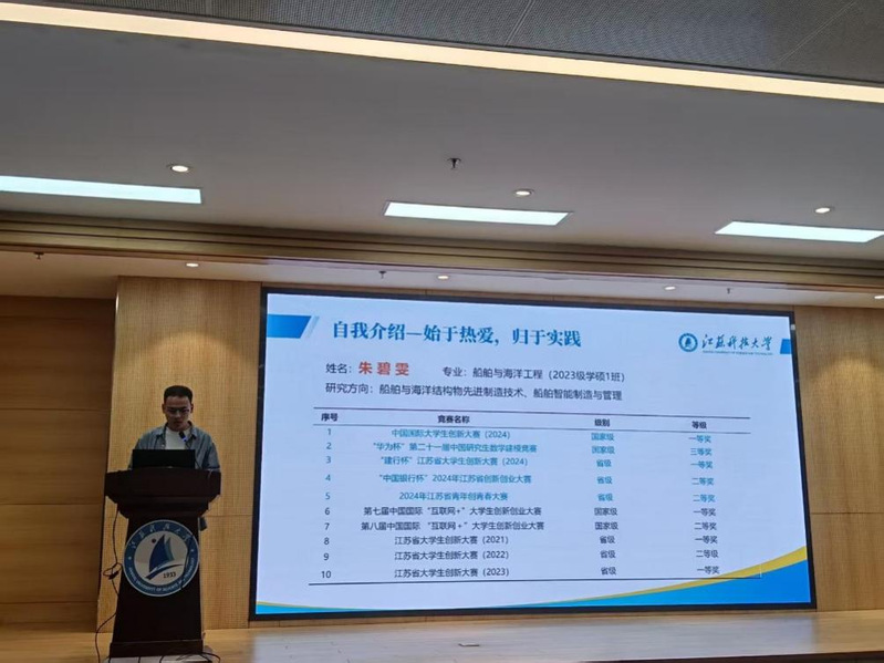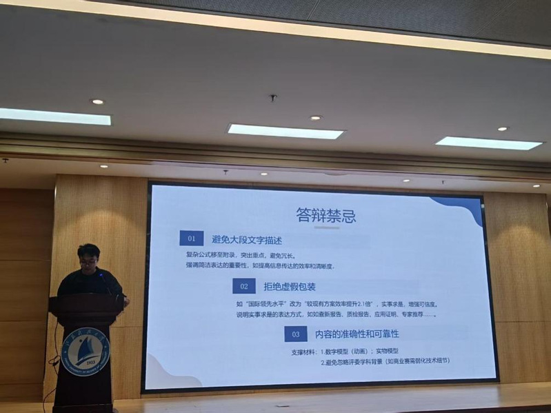 朱碧雯同学结合自己从零起步到拿下全国一等奖的经历,分享了组队、选题到成果落地的实用技巧。他强调组队时要找技术扎实的队友、擅长表达的成员和执行力强的项目负责人,不要只看头衔要看实际能力。在选题方面,他以自己做的船舶能源优化项目为例,说明如何把行业实际问题转化为竞赛课题,并提醒大家要提前规划技术实现路径。库一航同学重点讲解了答辩技巧,总结出“问题驱动四步法”:先讲清楚行业痛点,再展示解决方案,接着用数据证明成果,最后延伸到实际应用价值。他现场展示了获奖作品中的核心图表,强调“一张图只说一个重点”,比如用对比数据代替文字描述,同时提醒要准备好查新报告等证明材料。