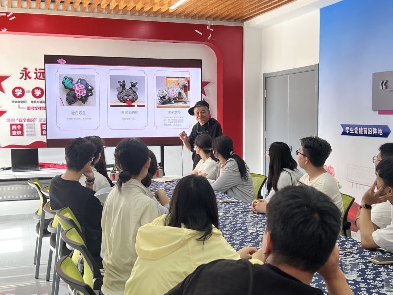 理论宣讲后,活动进入手作环节。周老师为同学们分发陶泥、刻刀等工具,并以“鱼化龙”为主题示范创作步骤:揉泥、塑形、刻画纹理……他熟练地揉泥、塑形,用刻刀在泥胚上勾勒出细密的鳞片纹理,再轻轻捏出龙首的棱角与龙须的弧度,一个活灵活现的“鱼化龙”雏形便跃然手上。细腻的手法与专注的神态,让在场师生直观感受到“匠人精神”的内核。同学们跃跃欲试,从揉泥定型到细节刻画,逐步投入创作。2024级土木水利专业学生赵闯专注地调整着鱼身的弧度:“原以为捏出鱼的形态很简单,结果既要保持泥胚的稳定,又要让龙首的神态‘立’起来,每一步都需要耐心和巧劲。”值得一提的是,回族学生马千禧在鱼身尾部融入了回族传统服饰中的“盘扣”纹样,龙首的鬃毛则以回族刺绣的“平针”手法为灵感,细腻的设计让作品兼具传统泥塑的厚重与民族文化的灵动。